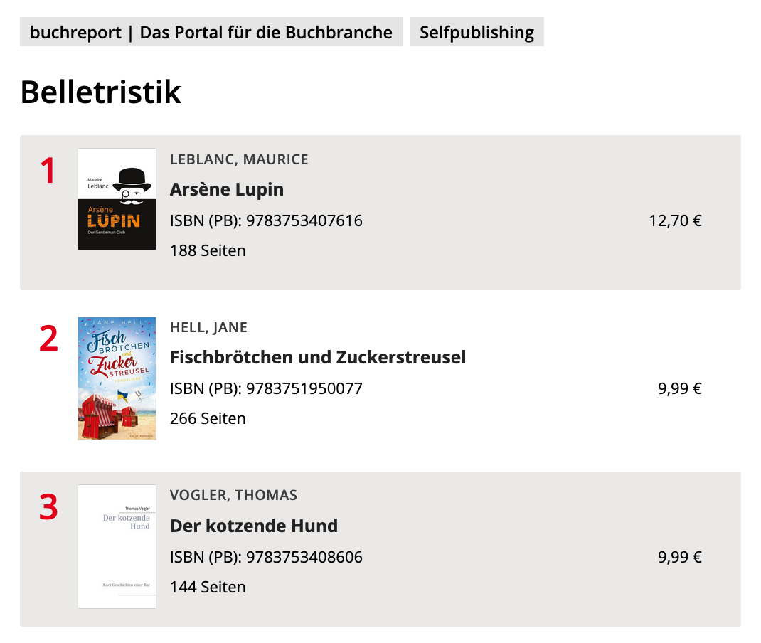 Am "Tag der Arbeit" muss es bei einem arbeitslosen Kulturschaffenden und Gastronomen wenigstens einen erarbeiteten Newsletter geben. Aber so ganz arbeitslos bin ich ja gar nicht. "Der kotzende Hund" dreht weiter seine Runden (welche Bilder entstehen Ihnen da im Kopf?!) und ist jetzt sogar auf Platz 3 der "Selfpublishing-Bestsellerliste" des "Buchreports" geklettert: