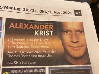 Letzten Sonntag hatte ich meinen Neffen zu "Alexander Krist" eingeladen. Sie wissen schon, Harry Potter, und so. Mitten in der Show wurden vier unterschiedliche Geburts-Daten vorgelesen und die dazu gehörenden Gäste auf die Bühne gebeten. Einer davon - war ich.